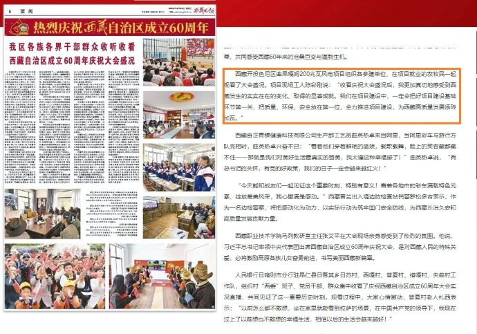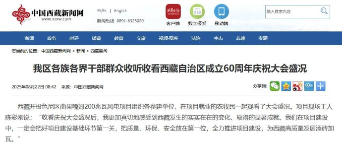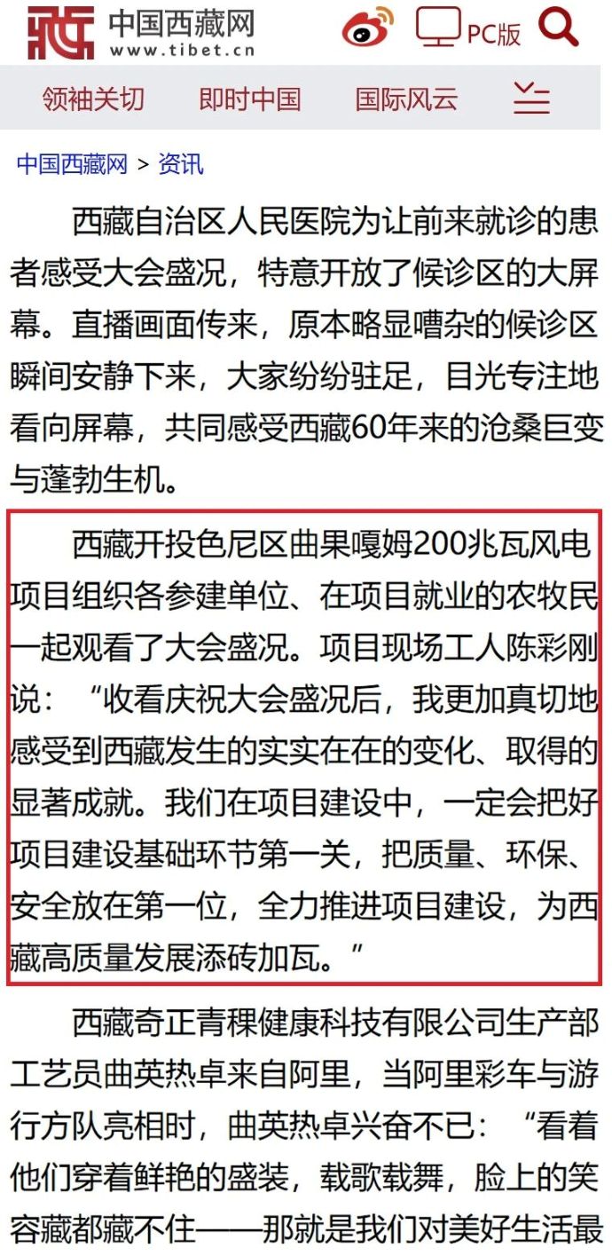 ?。冈?2日,西藏開投色尼區(qū)曲果嘎姆200兆瓦風(fēng)電項(xiàng)目組織各參建單位干部職工、在項(xiàng)目就業(yè)的農(nóng)牧民一起觀看西藏自治區(qū)成立60周年慶祝大會(huì)盛況的消息,被中國(guó)西藏網(wǎng)、西藏日?qǐng)?bào)、中國(guó)西藏新聞網(wǎng)、西藏法制報(bào)等各級(jí)媒體平臺(tái)宣傳報(bào)道。